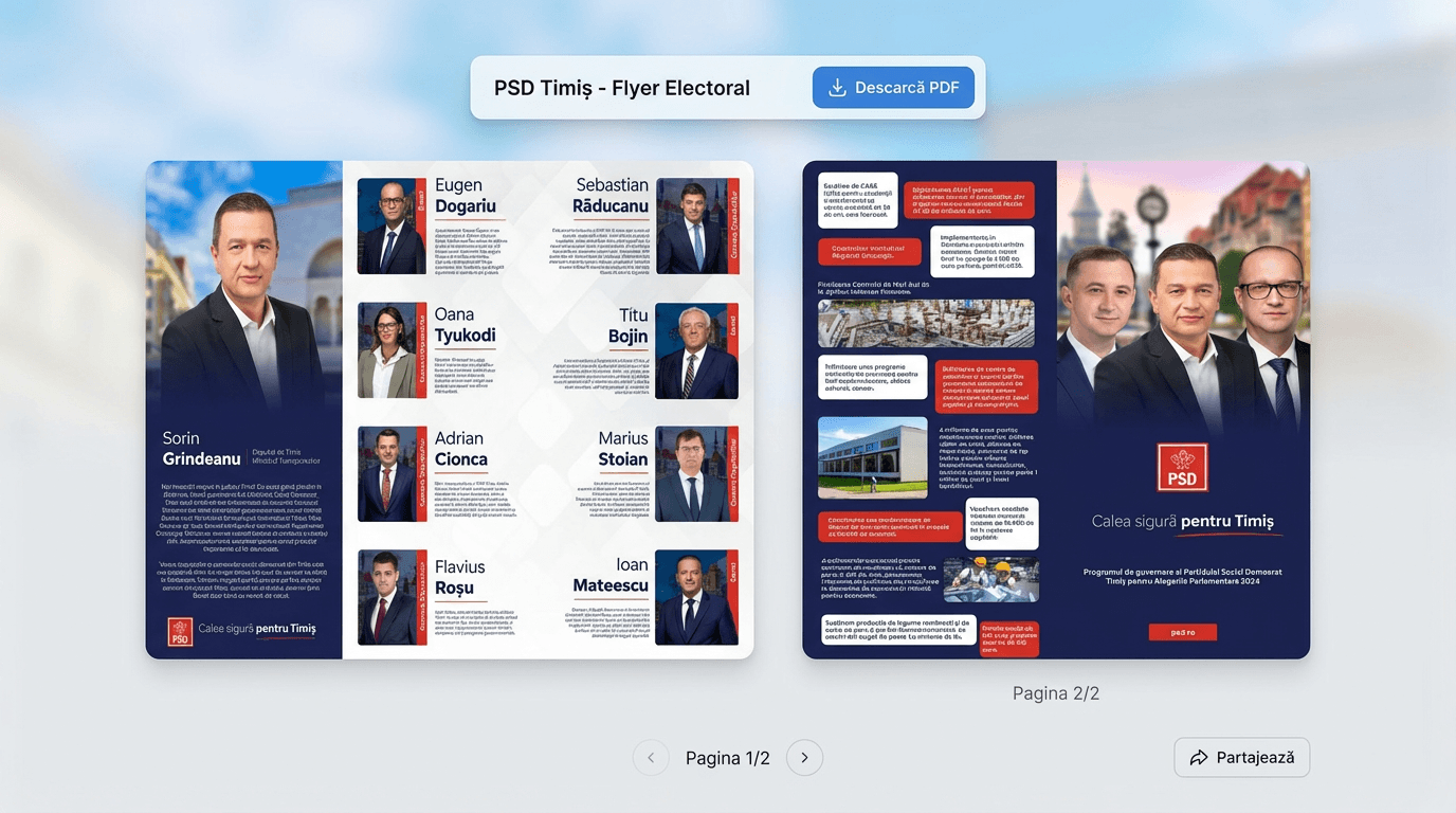 Political Campaign Designer & ConsultantRomanian Social Democratic Party (PSD) | 2020 – PresentAs the youngest campaign consultant specializing in marketing and design for Romania's Social Democratic Party, I've led the comprehensive visual identity and creative strategy for national and regional campaigns across Timiș County.Scope of Work:National and county-level campaign graphics spanning four years of electoral cyclesComplete visual ecosystem development including print collateral, digital assets, and outdoor advertisingMulti-format deliverables: flyers, posters, video content, motion graphics, and OOH (out-of-home) advertisingCustom 4-sided candidate cubes featuring PSD representativesPersonalized campaign materials tailored to diverse constituencies and messaging strategiesKey Achievements:Unified visual language across national and local campaigns while maintaining regional relevanceIntegrated design approach spanning traditional print media and digital motion contentStrategic use of outdoor advertising to maximize visibility and voter engagementRapid-turnaround custom materials responsive to evolving campaign needsCore Competencies:Graphic design, motion graphics, video production, campaign strategy, political branding, OOH advertising design, print production